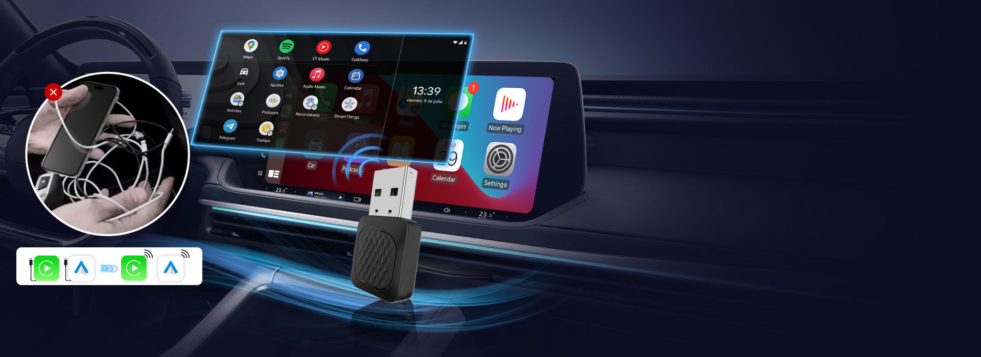 Featuring an ultra-compact design, only 19mm, comes with a built-in USB interface and simply plug it directly into vehicle's USB port for instant wireless connection. For vehicles equipped with Type-C ports, it includes a USB-to-Type-C adapter. Effortlessly convert the USB connection to Type-C compatibility using the provided adapter for universal compatibility.